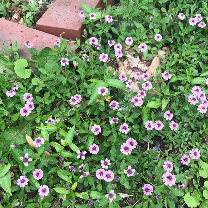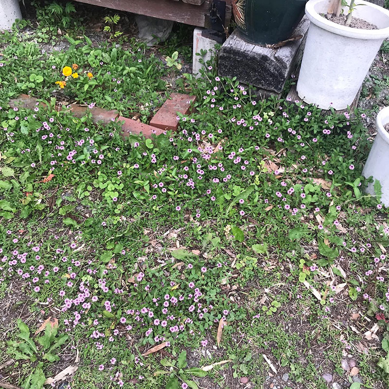 冬の間見えなくなっていたヒメイワダレソウ。花がたくさん咲いて玄関周りがピンクの絨毯を敷いたようになってきた。