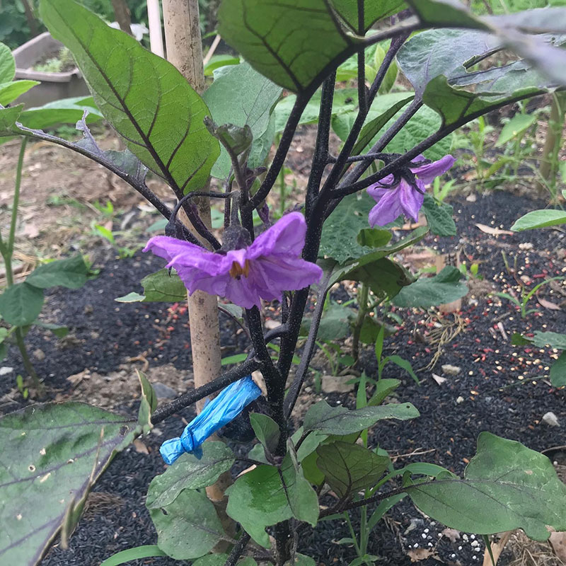 茄子の最初の実にリボンをかけて枯れるまで食べないでおく。この実から自家採種する。