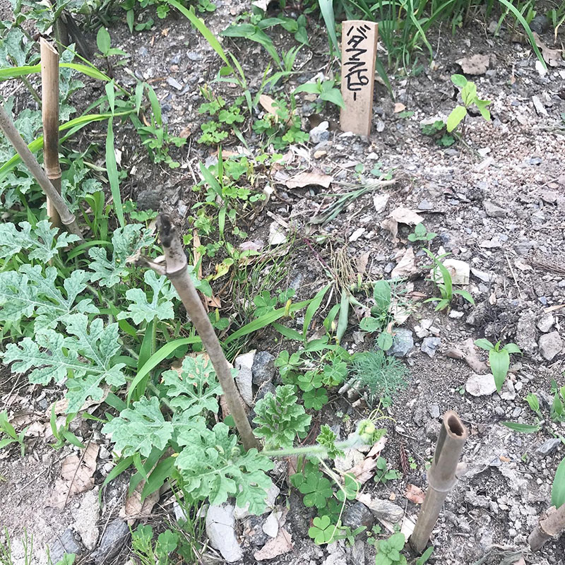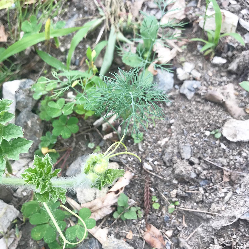 スイカの蔓の先端にディル。去年だ種からか育てたディルのこぼれ種からかあちこちで芽を出して育ってる・幸