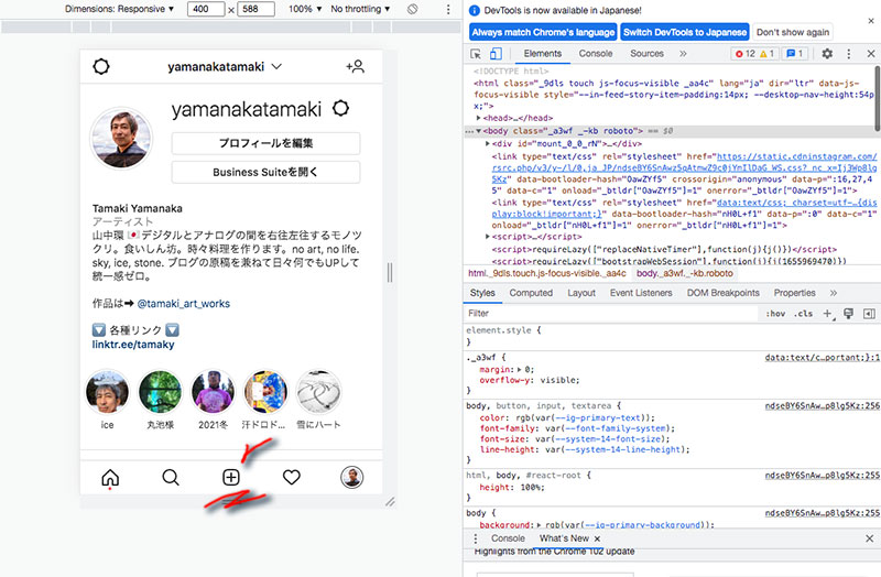 そしてPC版からもブラウザの開発者ツールからモバイル表示にすると投稿ボタンが表示される事を知った。写真1枚だけ、動画の投稿も出来ないけどちょっと思いついた事の投稿に使える。
