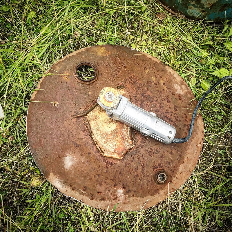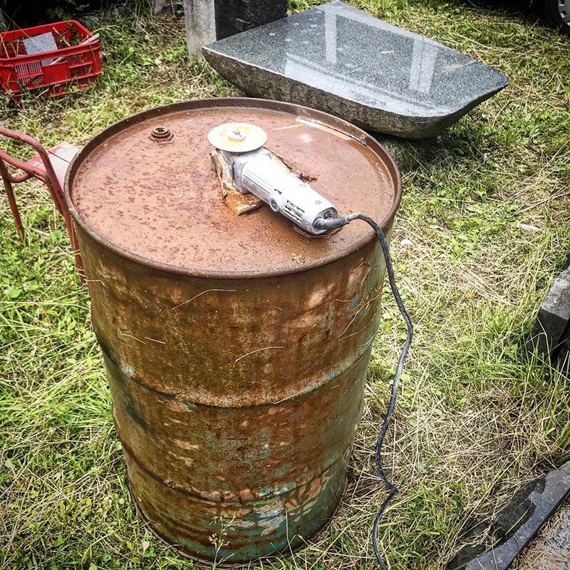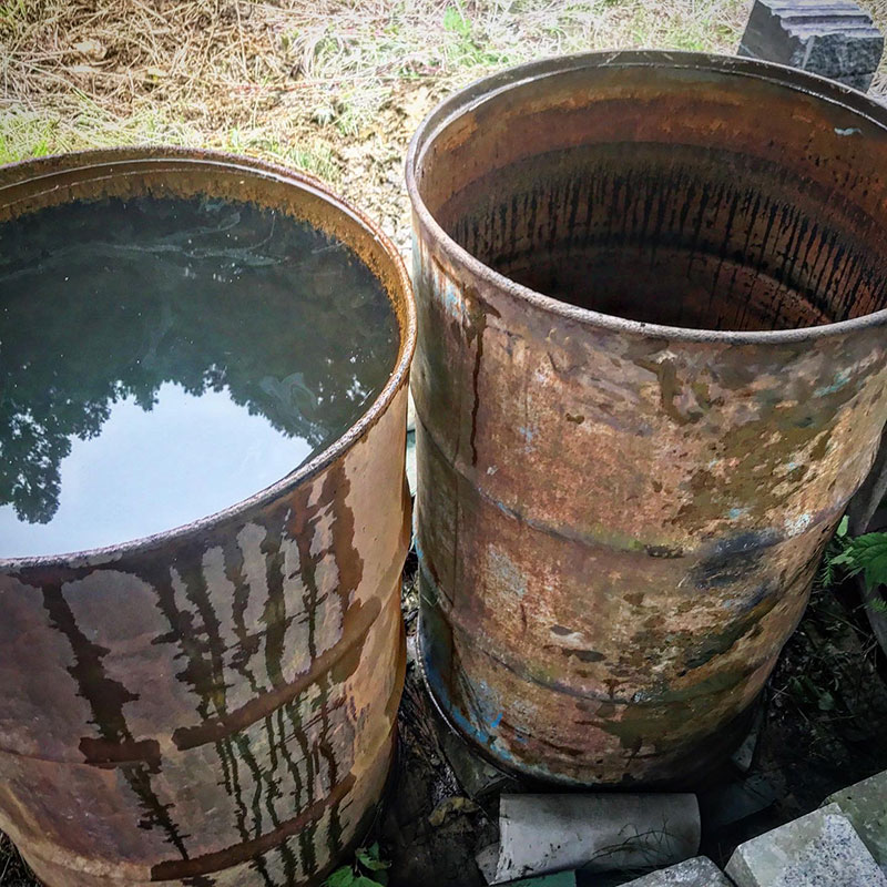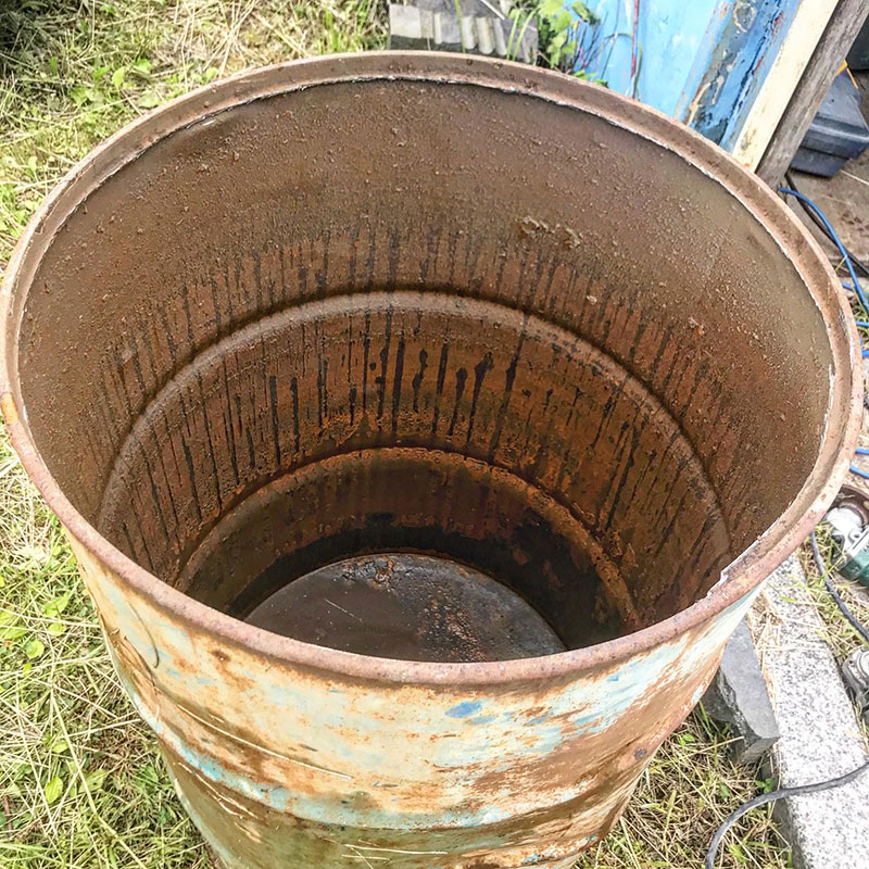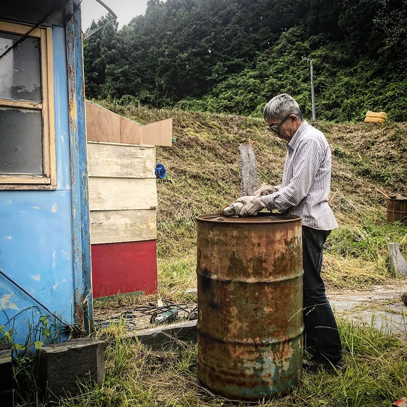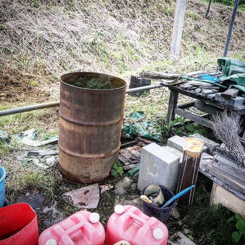 テントに降る雨水を溜めて水を使う仕事や冬に氷の彫刻を彫る材料の氷を作っている(笑)ふたつのドラム缶のひとつが錆びて水が溜まらなくなってしまった。