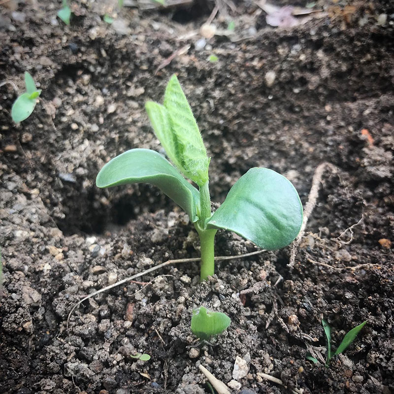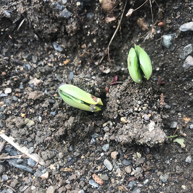 2種類の枝豆が次々に発芽してきた。念のため1箇所に2,3粒ずつまいてるけどほとんど芽が出るので、