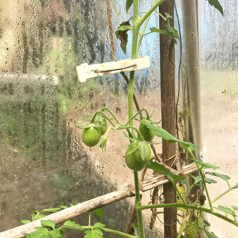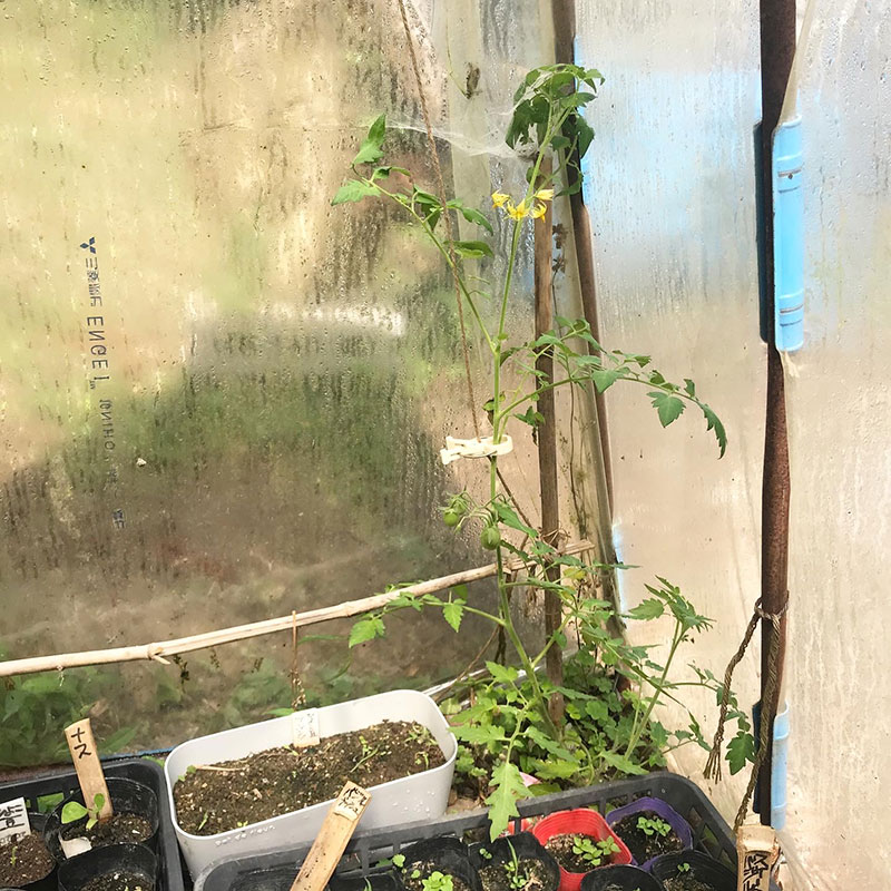 庭の猫の額ハウス にひとつだけ地植えしてるイタリアのミニトマト、シシリアンルージュに実がついた。ヒョロヒョロし過ぎてるからちゃんとなるかわからない。