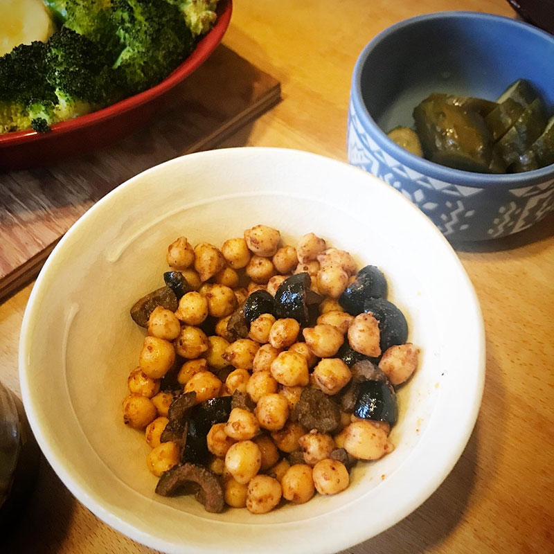 昨晩作っておいたガルバンソと黒オリーブの炒め物。きゅうりのぬか漬け。