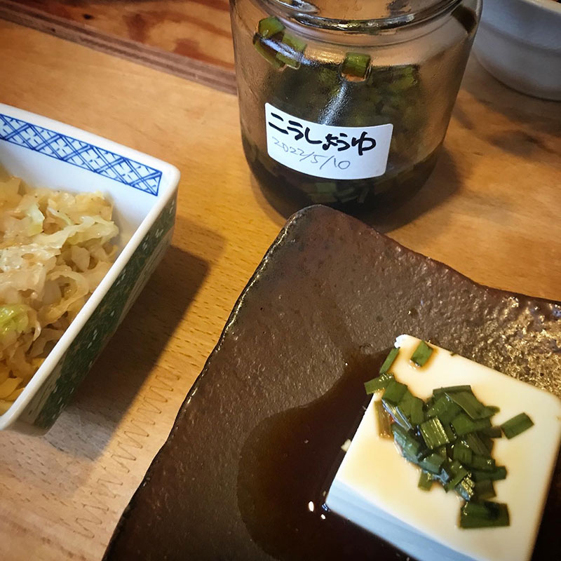 畑のニラで作ったニラ醤油の冷奴。ニラの旨味すごいな。