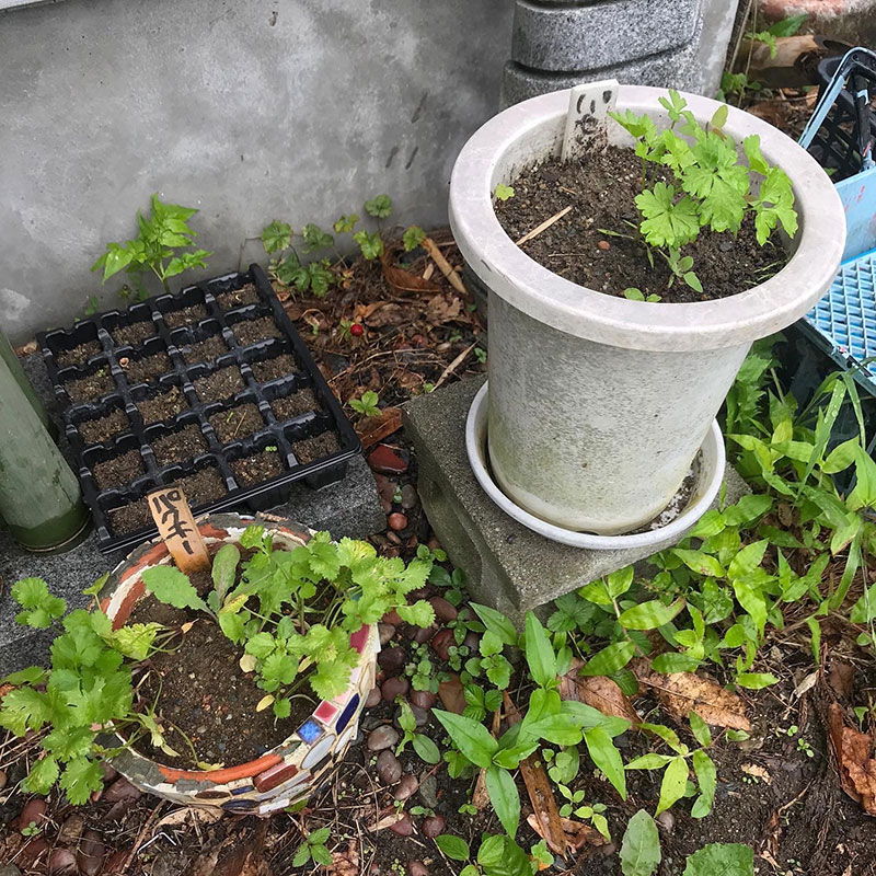 鉢のパクチーはスパイスカレー用にコリアンダーシードを取りたくて育ててる。