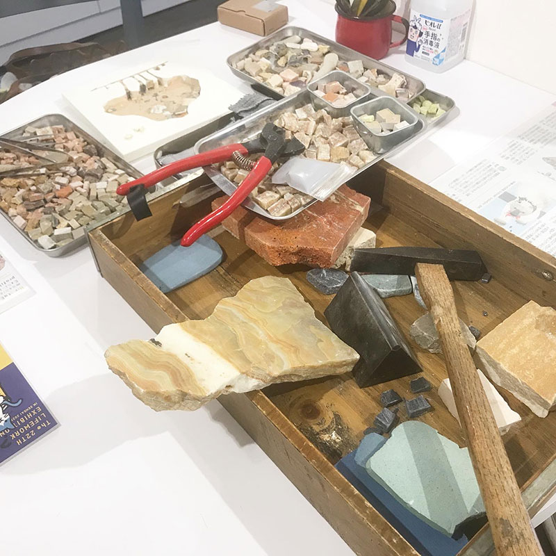 モザイクって全面が石などのパーツで覆われているけど平田恵利子さんのモザイクは板の抜かれた部分にメインのモチーフだけがモザイクで表されて背景はモザイクがされてない。その事で主題が引き立つし石や陶片などの存在感が増してる。