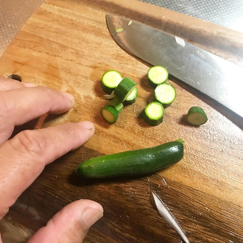 畑の小さな小さなズッキーニも入れた。
