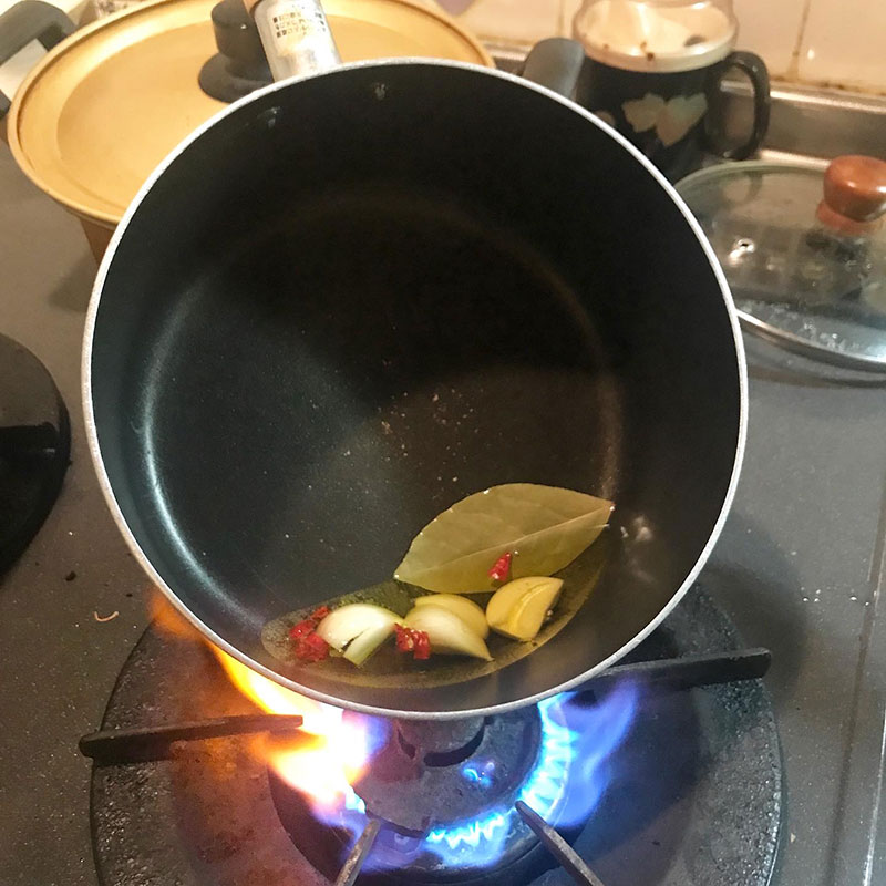 スパイスはコリアンダーシード、カルダモン、パプリカ、クミン、ターメリック、カイエンヌペッパー、黒胡椒。