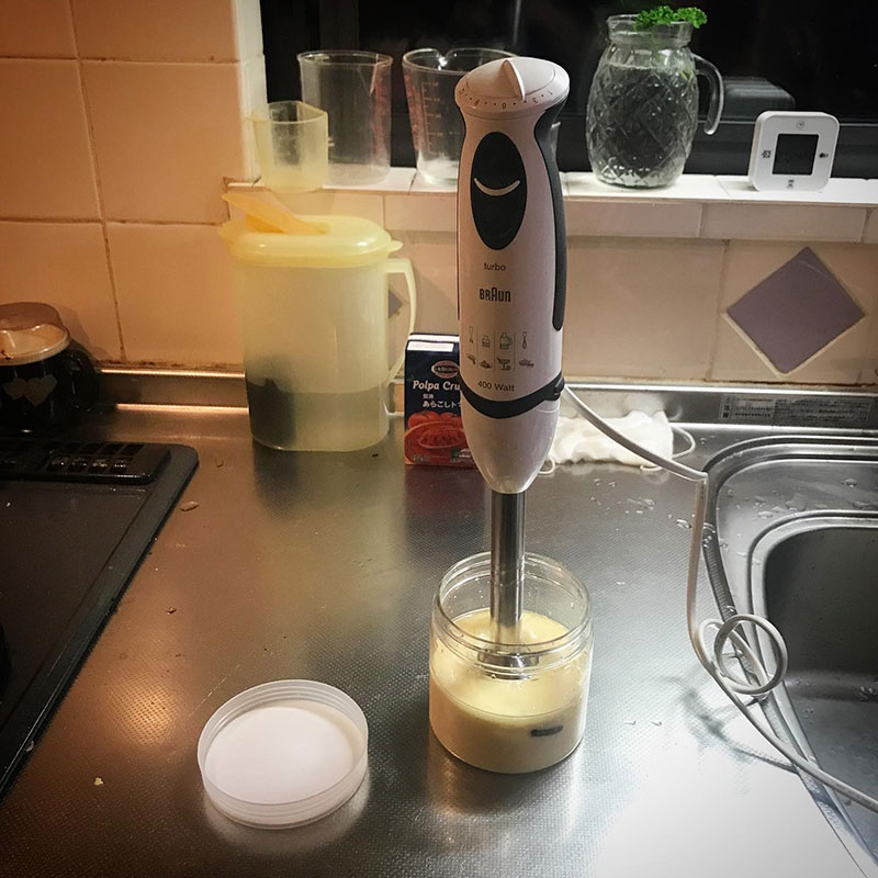 ハンドブレンダーでマヨネーズ作って今宵の仕込み、終了。