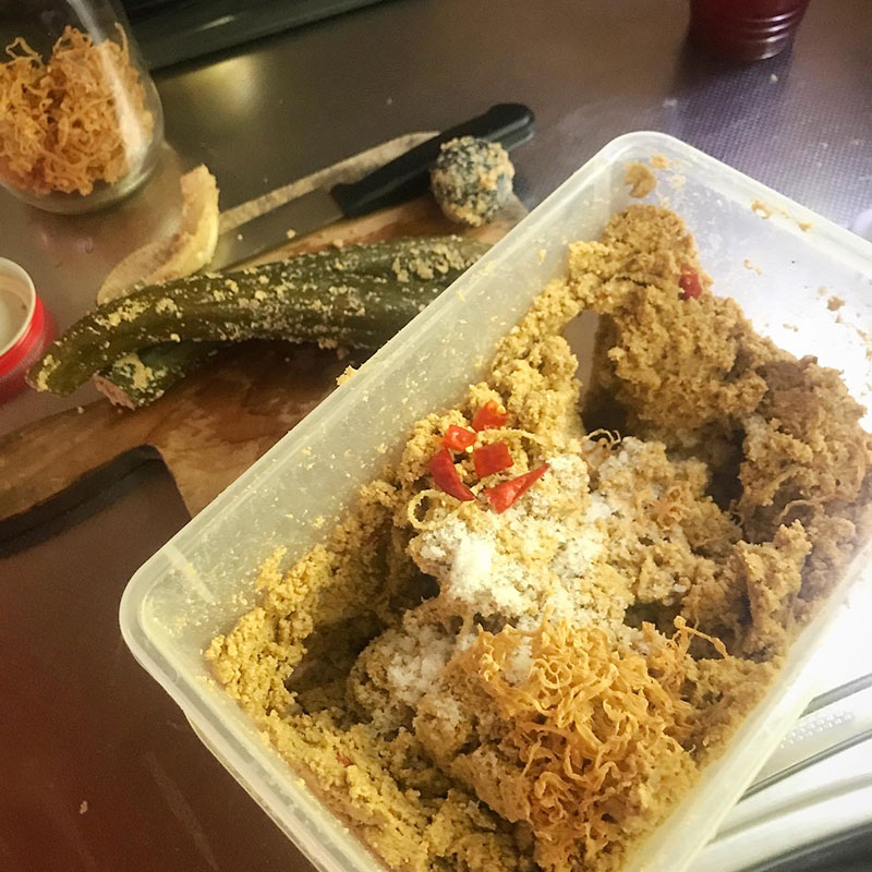 気温が高くなって産膜酵母が活性化してぬか床の表面が真っ白。乳酸菌が増えてる証拠で良いんだけどちょっと風味が落ちるので少し取って塩を足す。