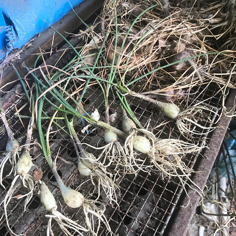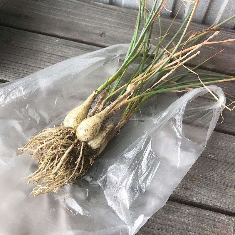 畑から抜いてきた根付きのエシャロットをいただいた。