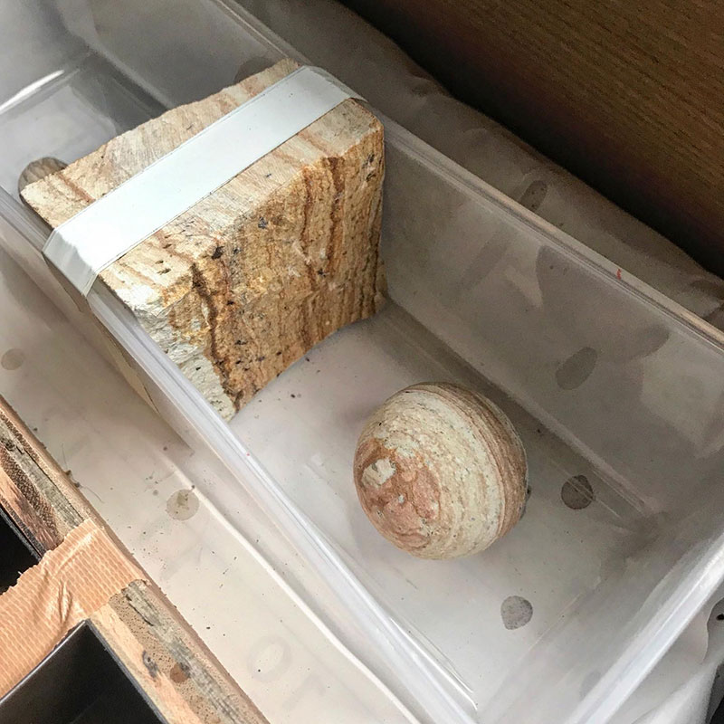 九州の天草木目石を木星に見立てて透明樹脂の宇宙に浮かべる “Jupiter” という作品。