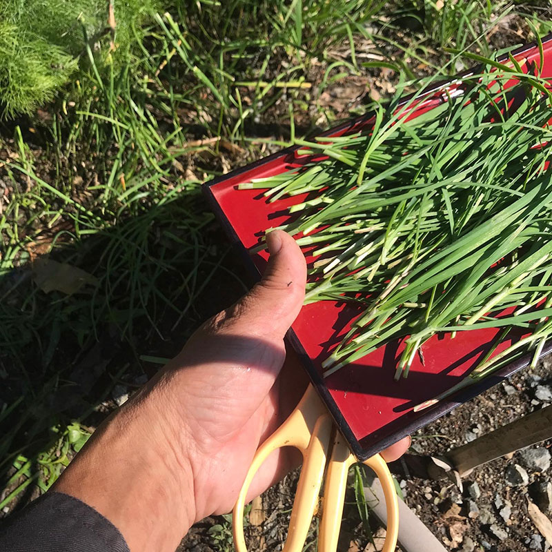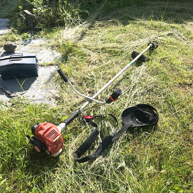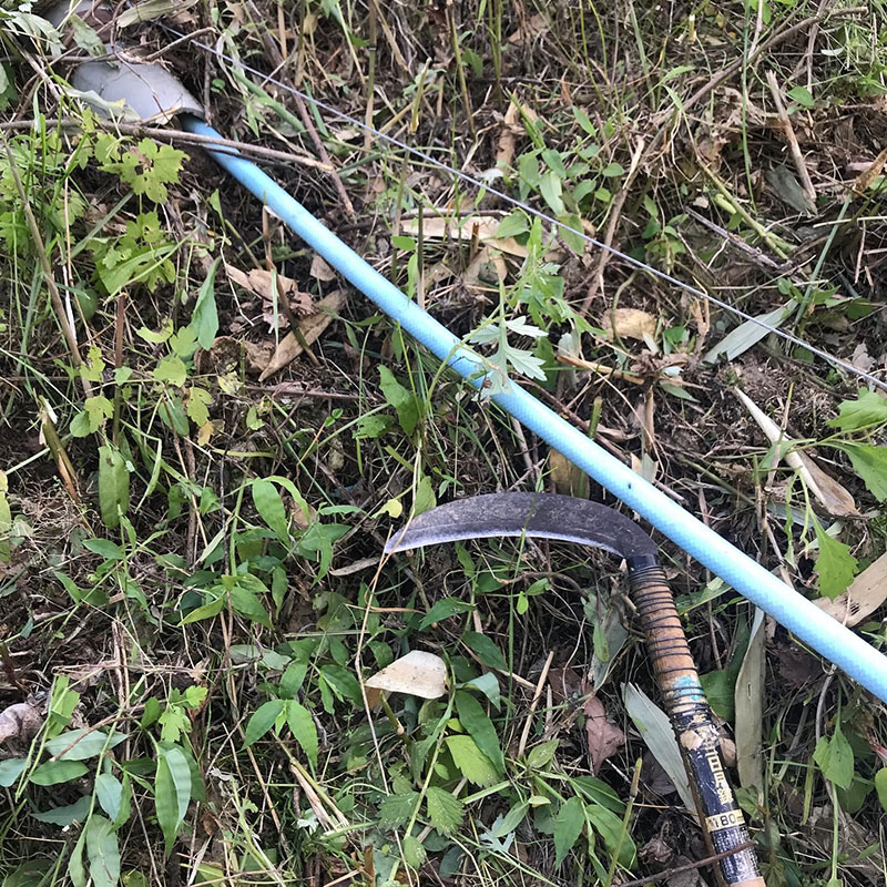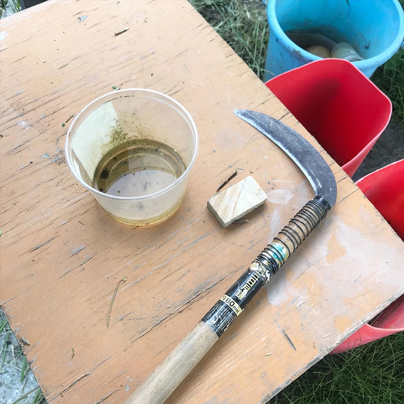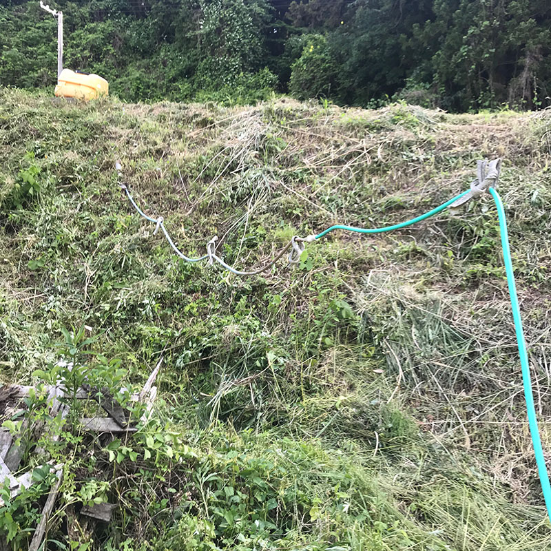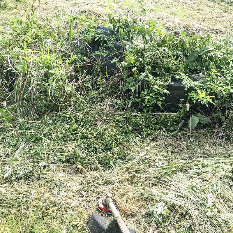 刃で刈りきれなかった水仕事用のホースの周りは鎌で手刈り。