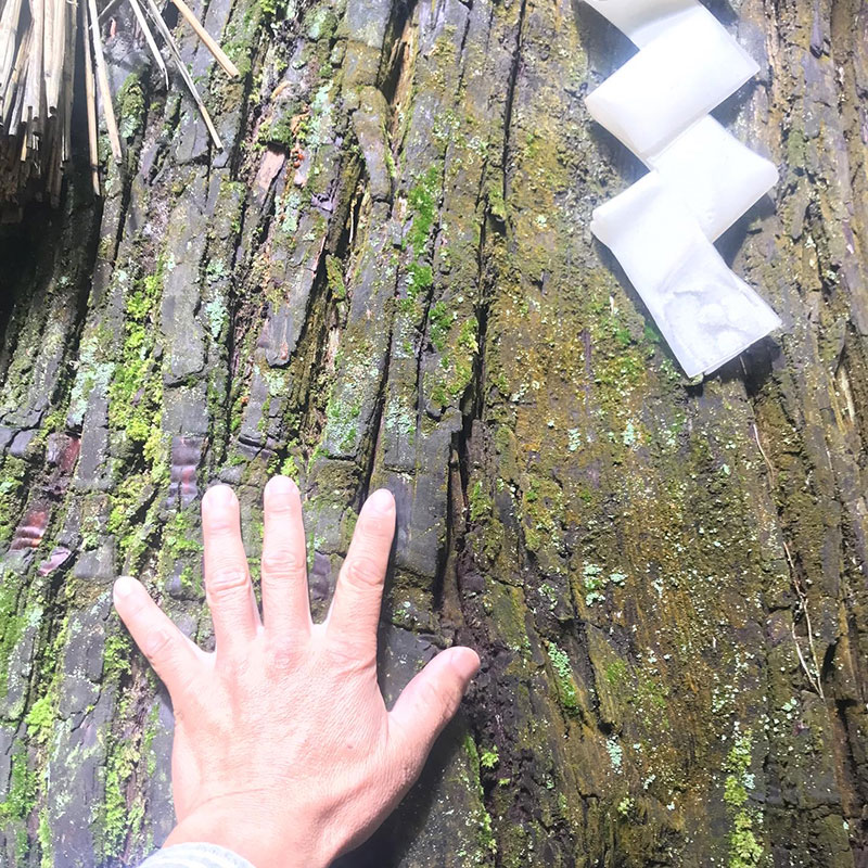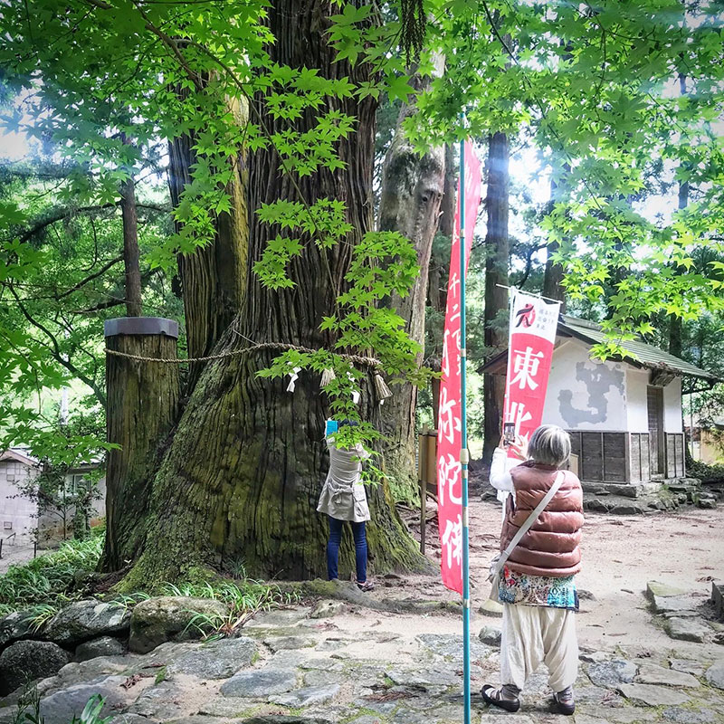 樹齢800年の大杉に手を当ててパワーをもらう。