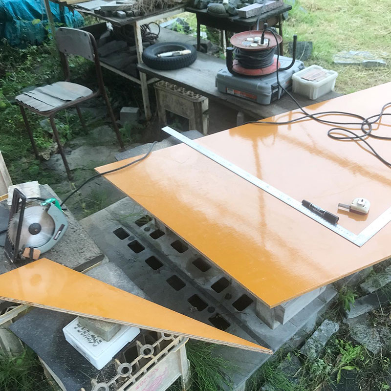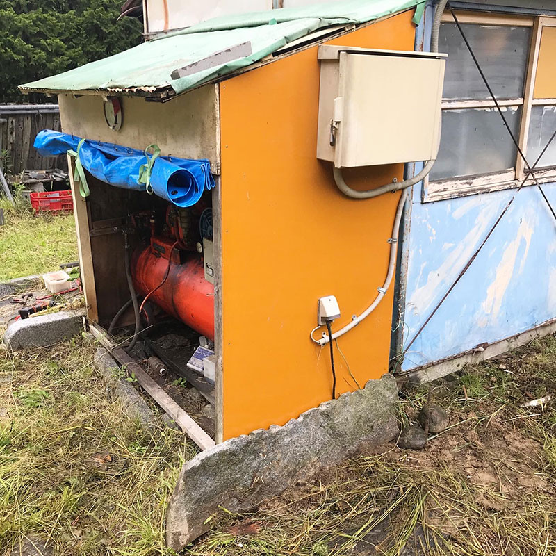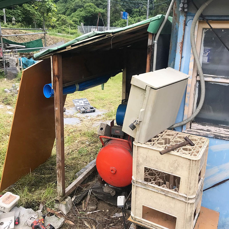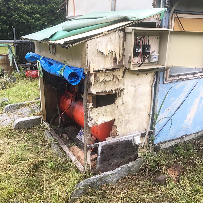 友だちと分かれて仕事場へ。先日の大風で壊されたコンプレッサー小屋の修理。