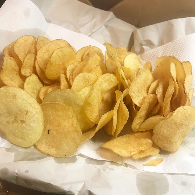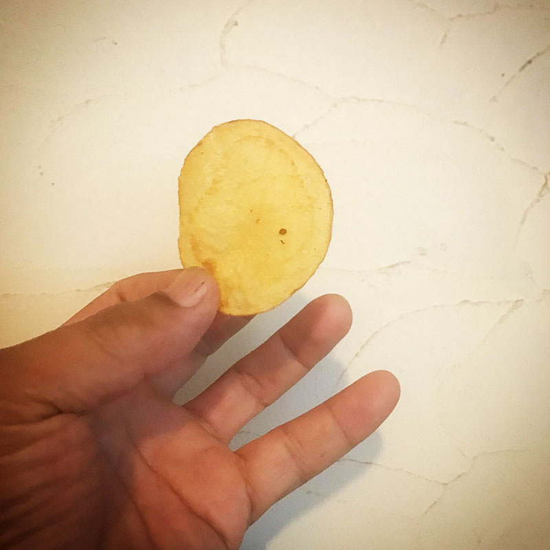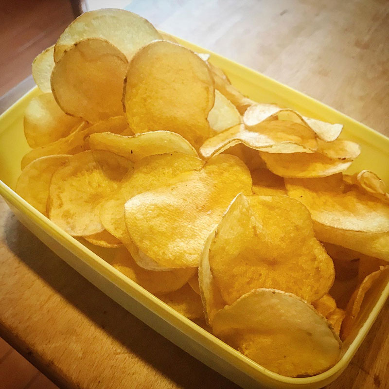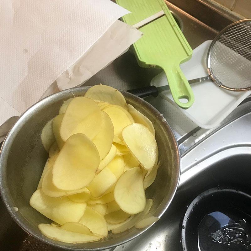 スコールとカミナリで石彫りに行かれない午後、ポテトチップス揚げる。