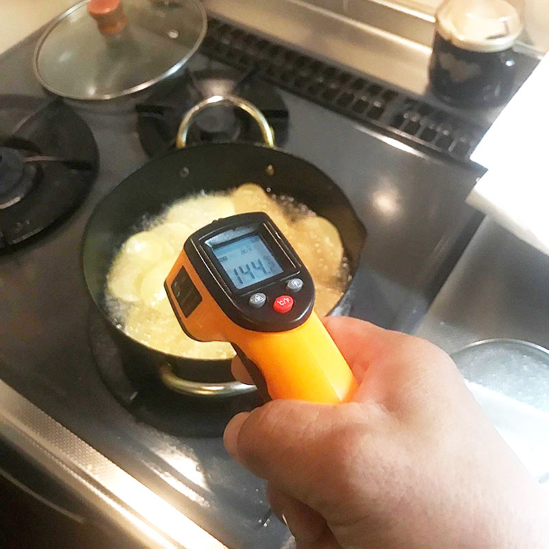 最初の油の温度だけ非接触型温度計で測るけど後は泡の出方で揚げの状態は判断できる。