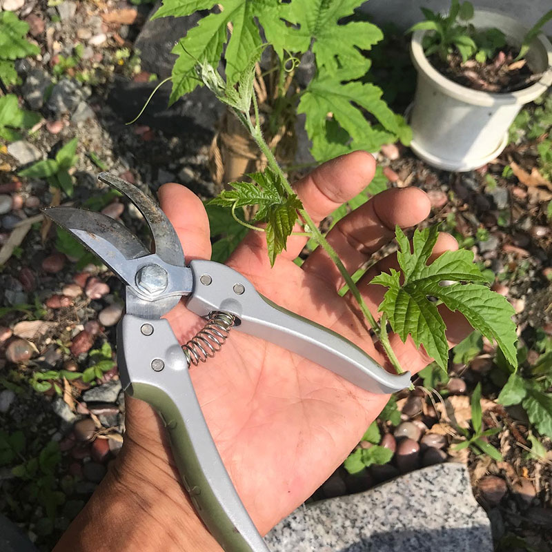 気温が上がり、ここにきてやっと大きくなり始めたゴーヤの摘心。