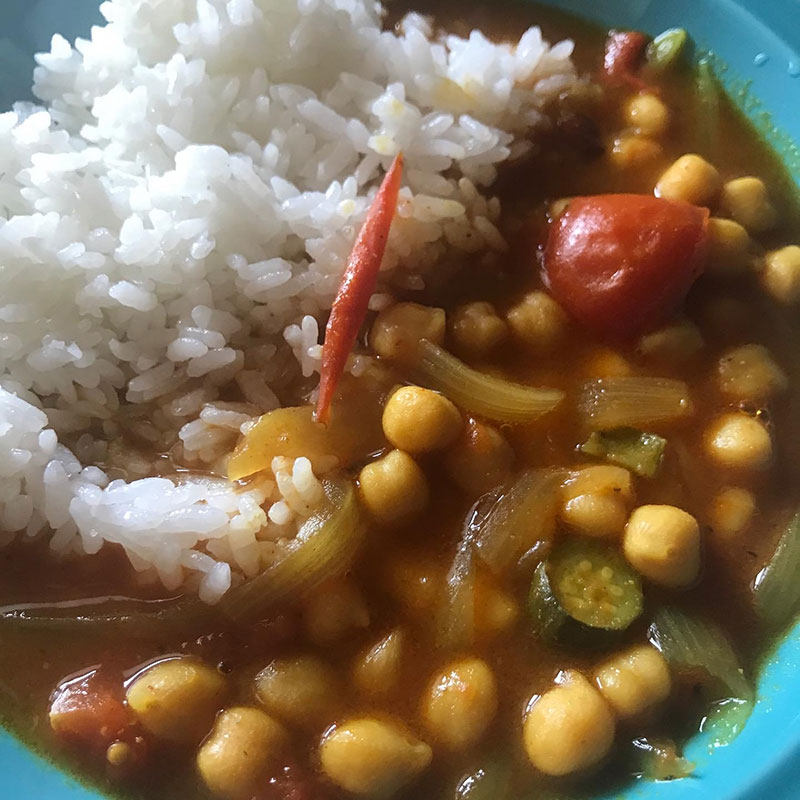 昨晩仕込んだガルバンソのモロッコ風煮込み、スパイスカレーに使うスパイスいっぱいなのでもはやカレーだ。ご飯にかけて昼飯に。