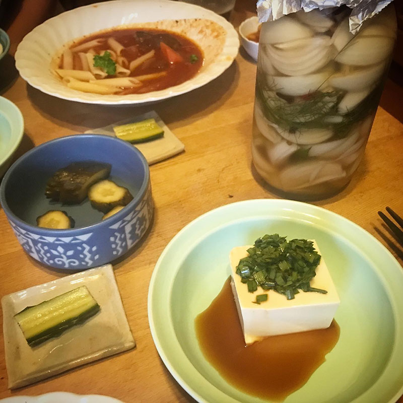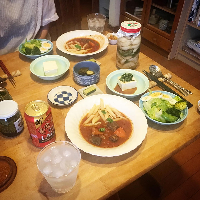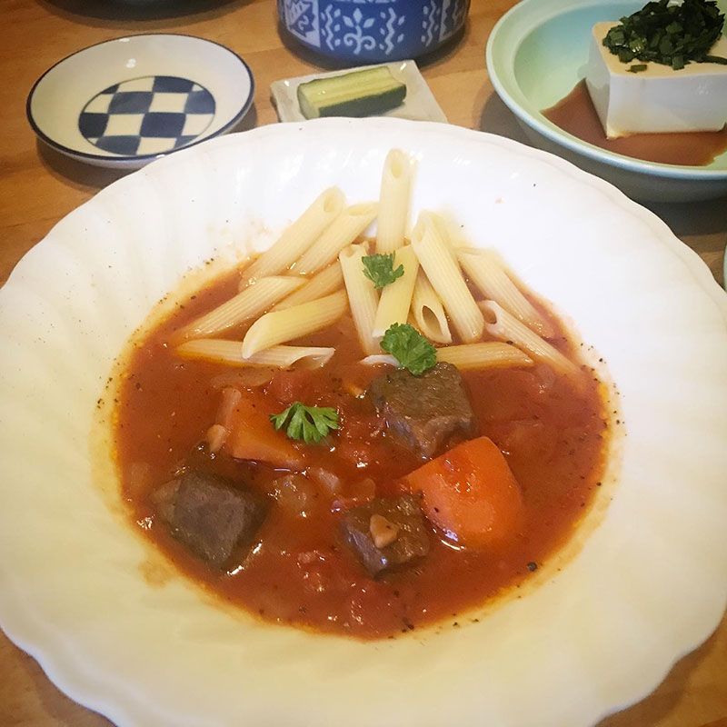 メインは昨晩から煮込んでいた牛スネ肉のトマト煮。ペンネを添えて。鍋の熱を断熱してくれて余熱で火を入れていく、という今は亡き叔母さんが作って贈ってくれた魔法の鍋帽子で今日も朝と昼飯に戻った時に鍋を沸騰させては入れてたので昨晩からコトコト一日中、火にかけていたようなもの。牛スネ肉はトロトロでした。これからも大切に使い続けていきますよ。叔母さん、ありがとう。