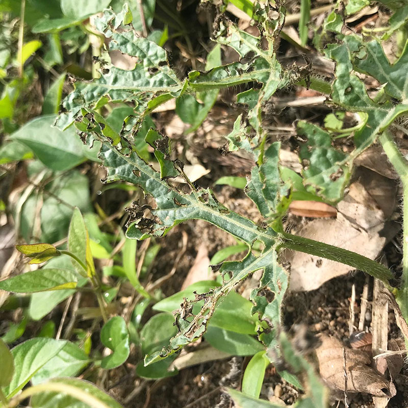 スイカは湿気に弱い。ずっと湿ってて葉がぼろぼろなところに虫にも食われまくりでダブルパンチ。