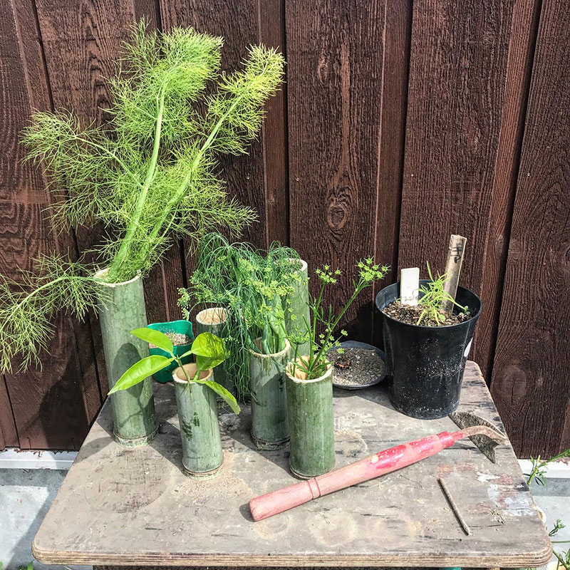 刈ったイタリアンパセリの花を咲かせたくて竹の一輪挿しに挿してるけど咲く前に枯れちゃうかな。