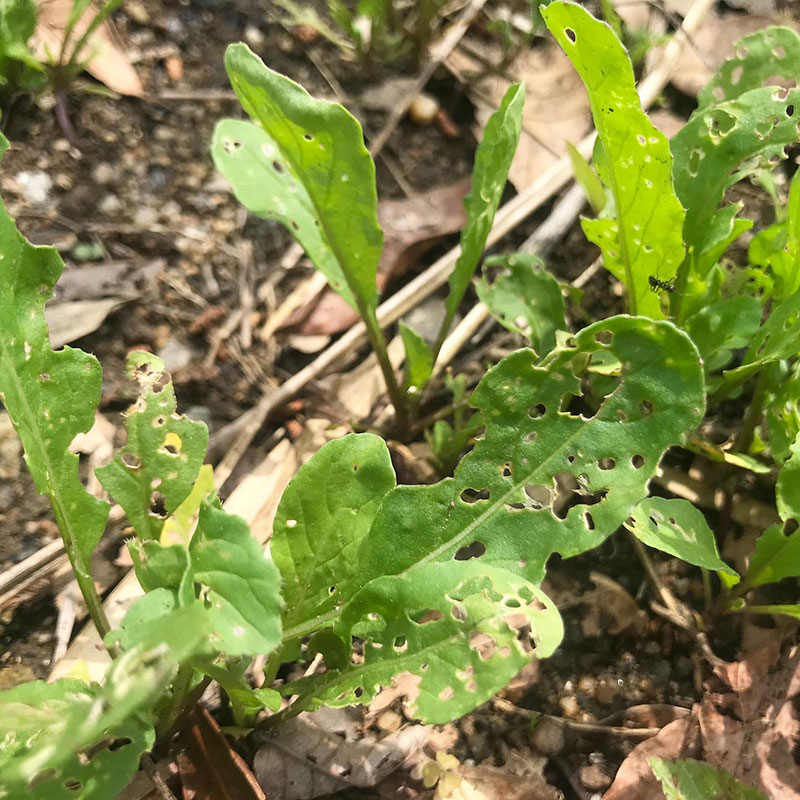 畑のルッコラは虫にやられてぼろぼろ。諦めて虫に全部あげる。(ミニハウスの中でプランターで育て始めた)