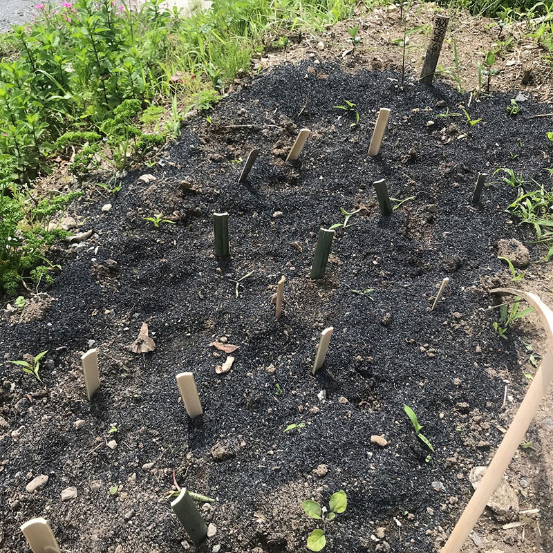 自家採種した種から育てて3日前に畑に移植した茄子と赤唐辛子、憎き猫どもにガチャガチャにされて茄子と赤唐辛子ひとつずつダメにされた。殺意湧いてきた!棒を刺すと良い、と教えてもらったので竹で作った畑用の名札を刺しておく。