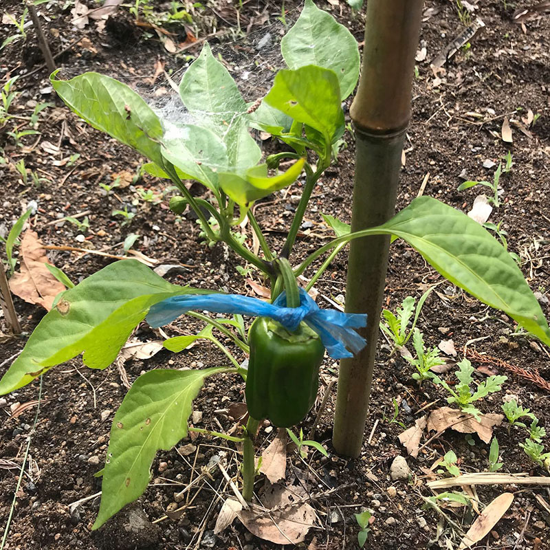 自家採種するためピーマンの一番最初になった実にリボンをかけておく。
