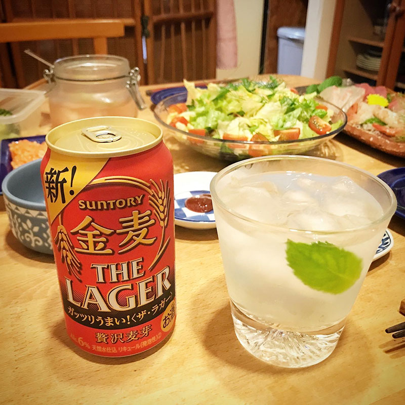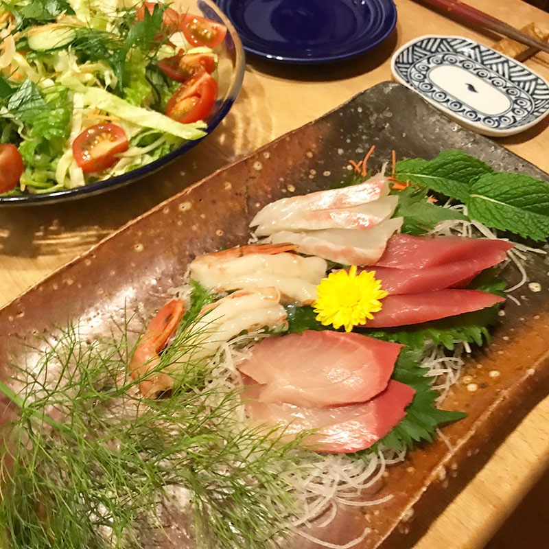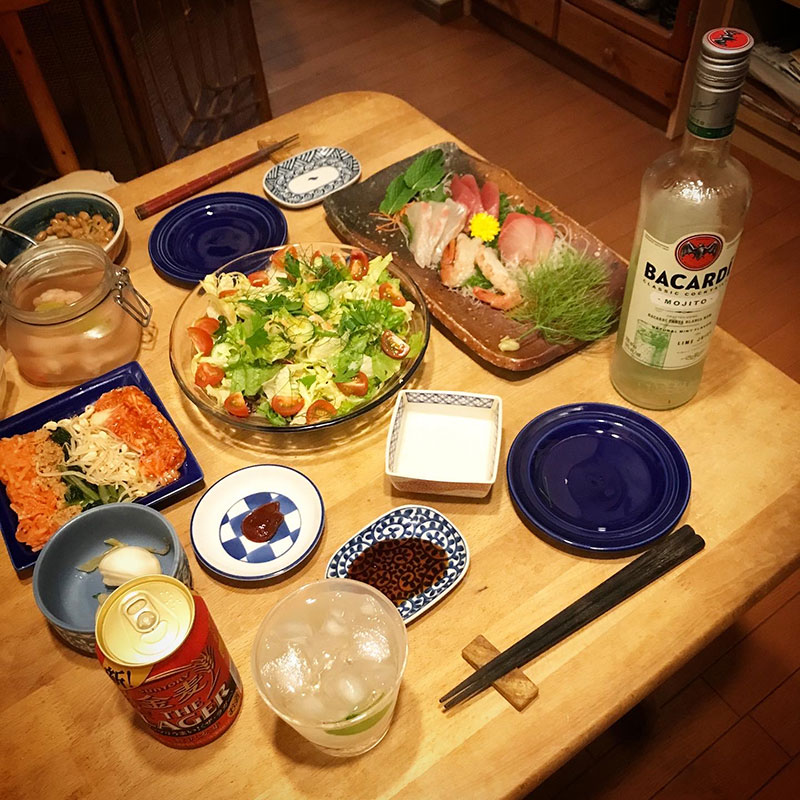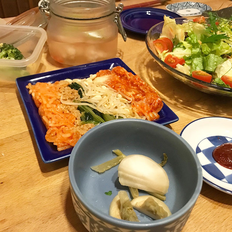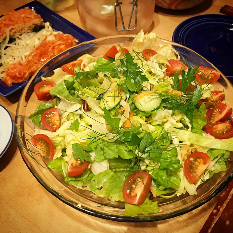 痛みそうな葉物で山盛りサラダ。自家製ドレッシングで。きゅうりやにんじん、新玉ねぎ。畑からイタリアンパセリやフェンネル散らして。