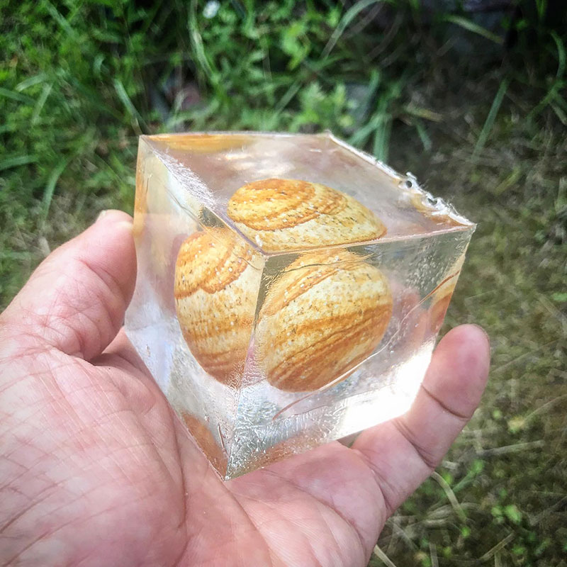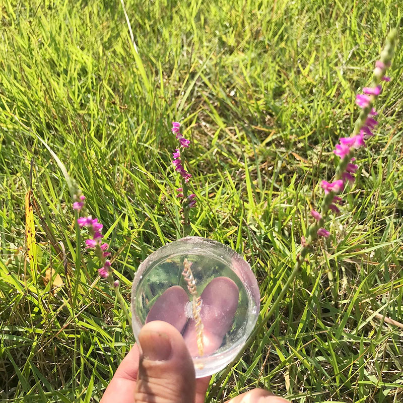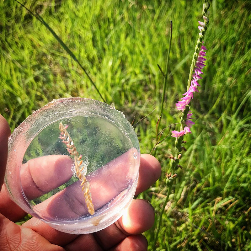 透明樹脂に封入してみたネジリバナ。予想通り鮮やかなピンク色は失われてしまった。