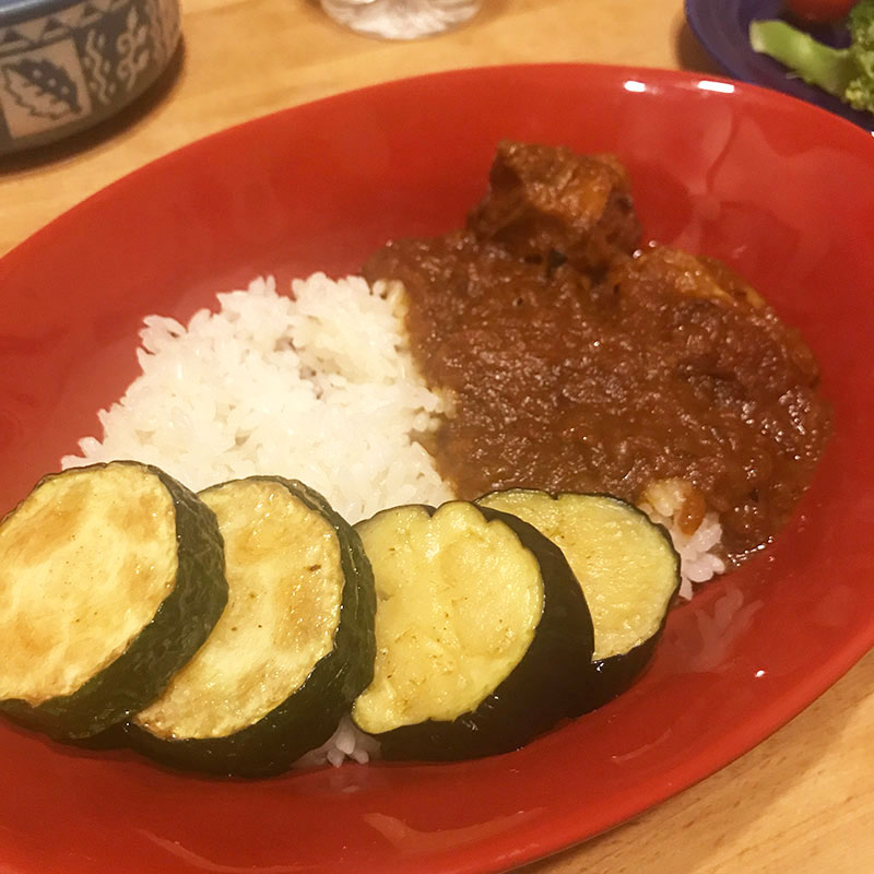 昼に仕込んだスパイスカレーの夕食。カミさんがナスとズッキーニ素揚げにしてくれた。素揚げの夏野菜ってスパイスカレー との相性、最高。