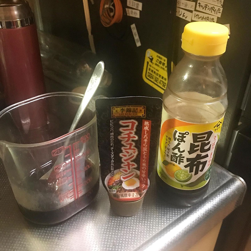 名前の通りコチュジャンとポン酢を混ぜて大葉を漬けるだけ。