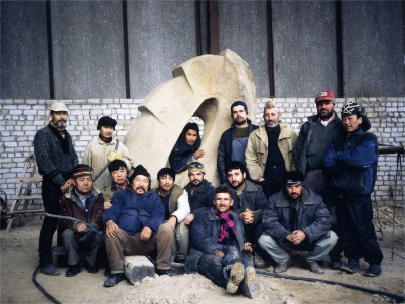 僕が制作中の彫刻の周りにその時の彫刻シンポジウムに参加していた各国の彫刻家に集まってもらって撮った一枚。前列左端がカルメキアのパパ、ヴァイスキン。この時、僕(前列左から4人目)が着ている防寒着はヴァイスキンが貸してくれたもの。