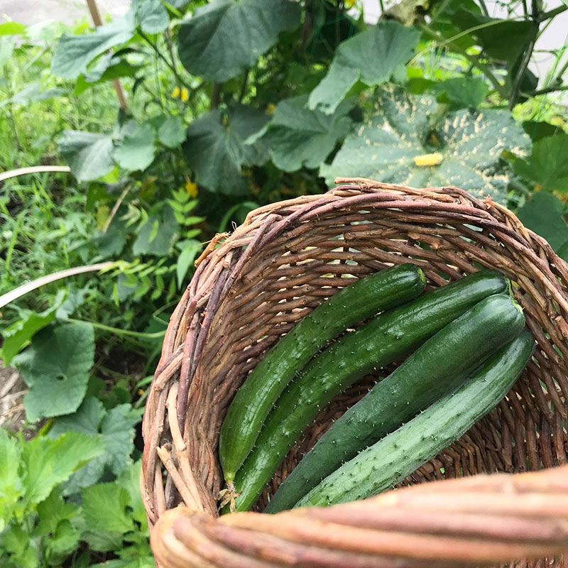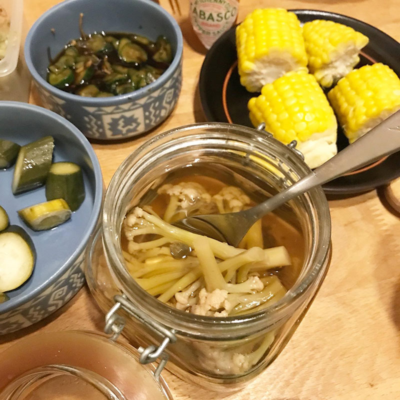 食べるのが追いつかない畑のきゅうりと一緒に送ろう。荷造り頼んだカミさん、他の野菜と一緒に小さな新玉ねぎのピクルスとカリフローレのピクルスも同封したって。