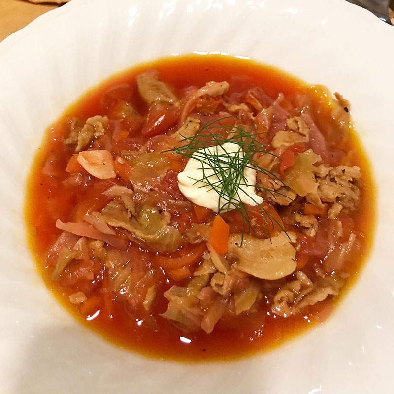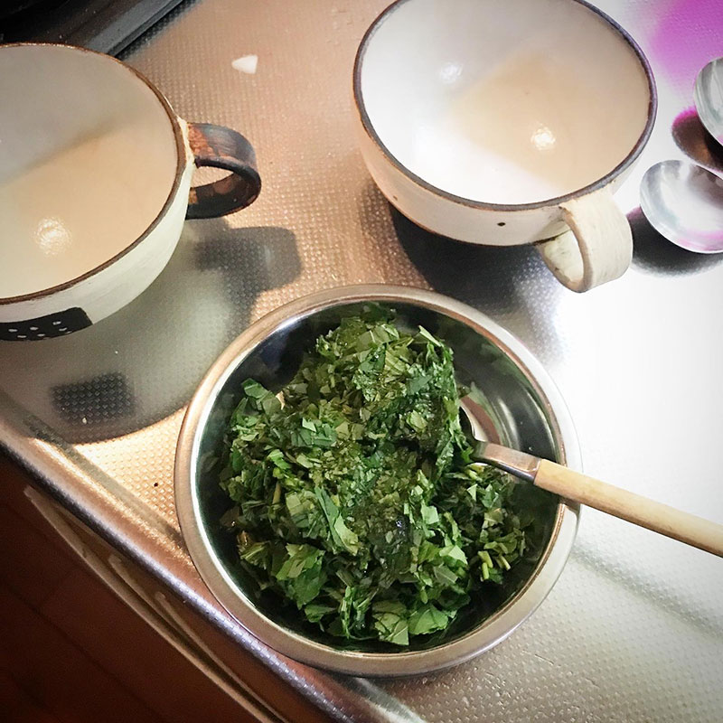 そしてボルシチのためにビーツと共に畑で育ててるディルの葉を散らして。サワークリームとディルの無いボルシチは炭酸が抜けたビールの如し。特にディルの香りは特別。他で嗅ぐ事がほとんど無いのでこれを食べるとロシアの彫刻シンポジウムで毎日の様に供されたボルシチの香りと食卓の風景を思い出す。僕にとって数少ない香りの記憶。