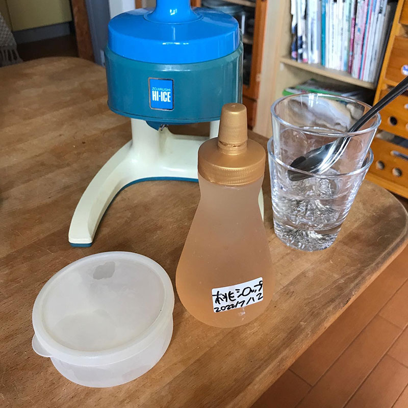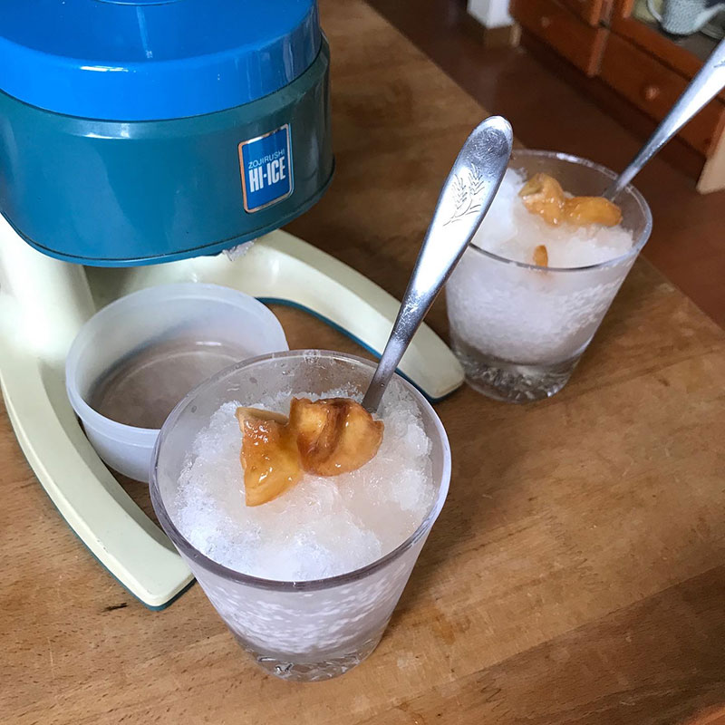 今日のかき氷は桃のシロップ。透明でどこにどれだけかかってるのかがわからないのが難点。皮も一緒に漬ければ桃色になるんだけど無農薬の桃が見つからなかったので実だけで漬けた。