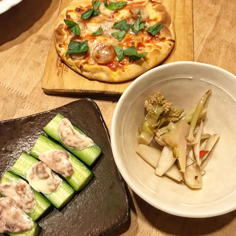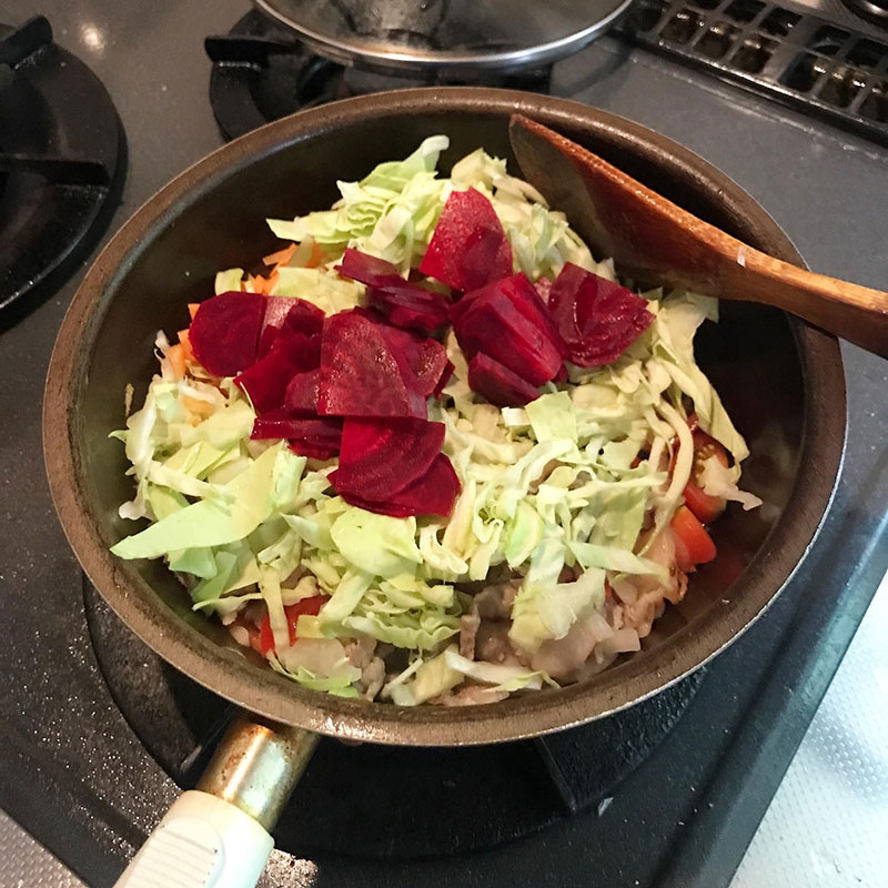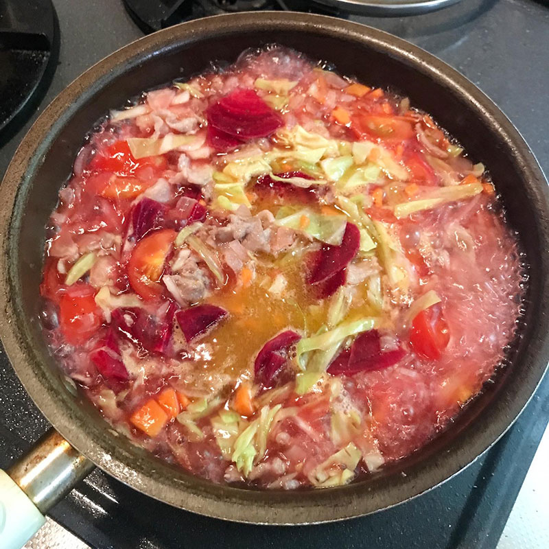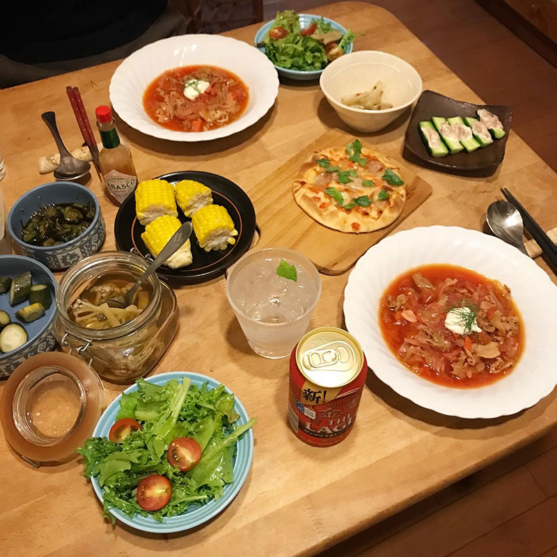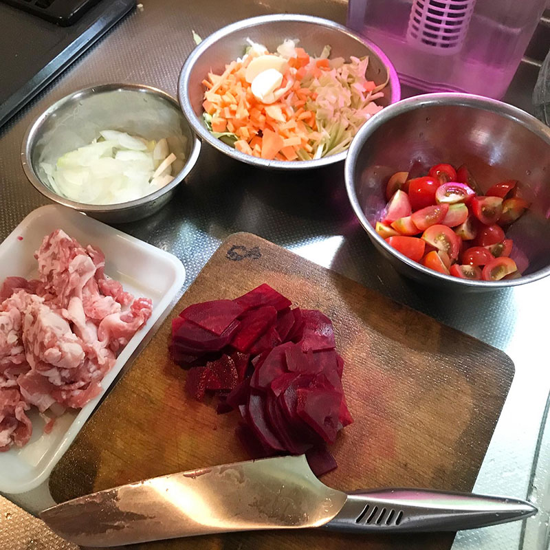 居酒屋我家、開店。今宵のメインは畑で育てたビーツで作ったボルシチ。美味しく食べるためにサワークリーム買ってきた。