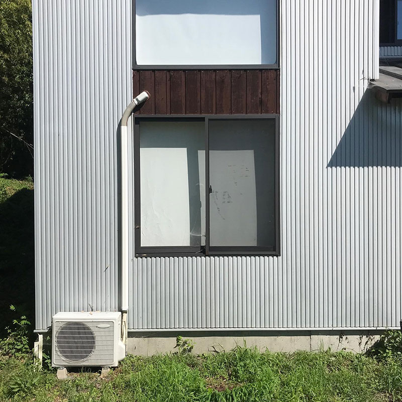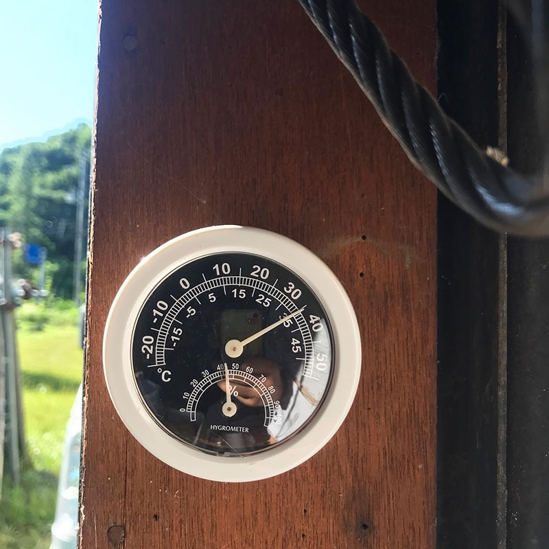 プレハブ小屋の温度計は36℃、