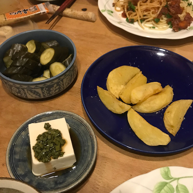 サラダ用にいろいろな葉を摘んできてきゅうりはぬか漬けに。冷奴には自家製ニラポン酢。