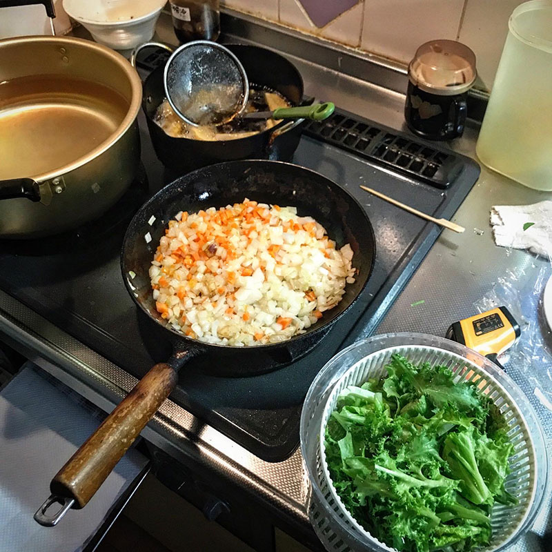 ミートソース作りながらフライドポテト揚げて。