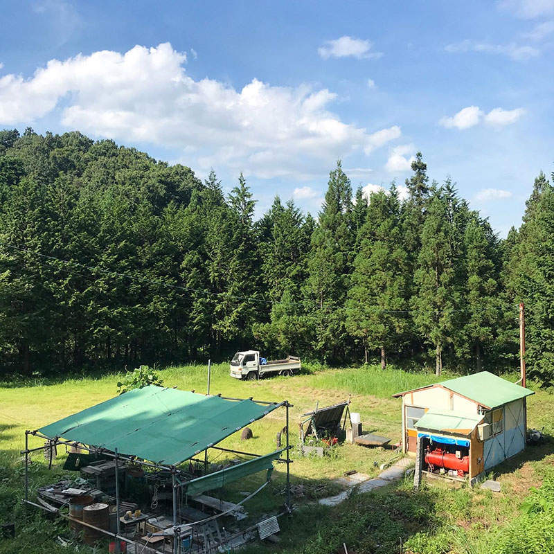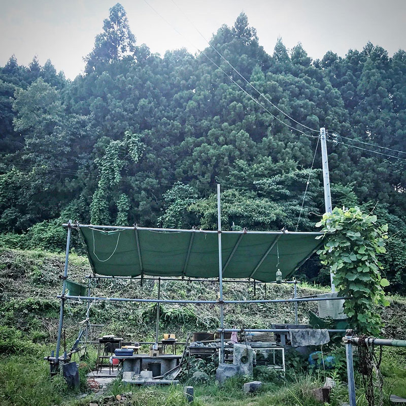すぐ裏に山を抱えてるので冬の午後は全く日がささない仕事場。逆に夏でもテント下はそれなりに涼しくしてくれる。