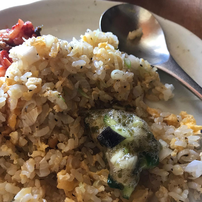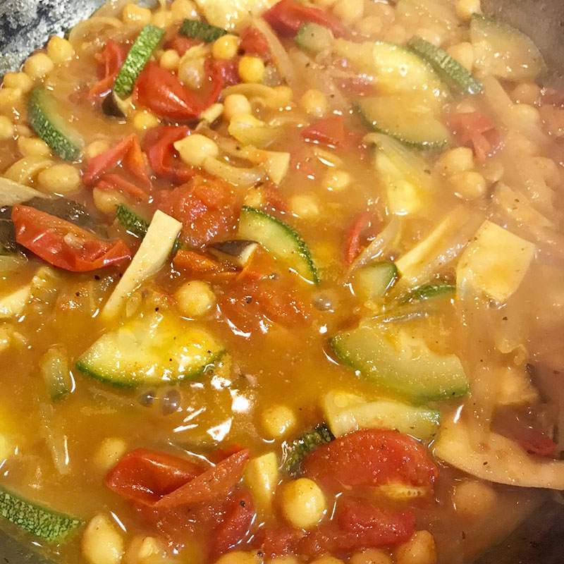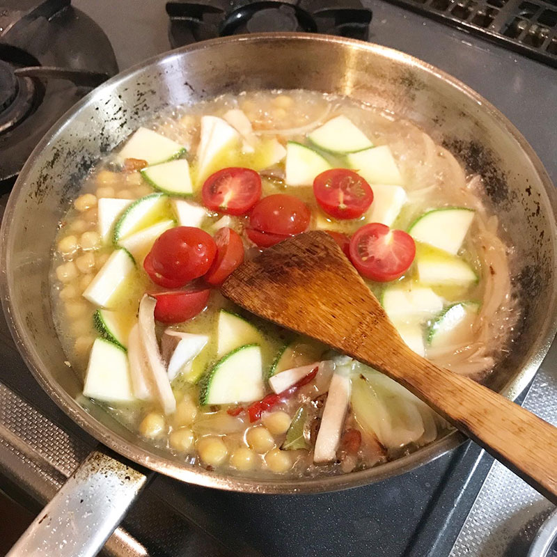 ニンニク、玉ねぎをオリーブオイルで炒めて冷蔵庫にあったズッキーニ 、エリンギ、ミニトマト。赤唐辛子。