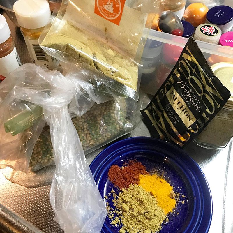 塩、胡椒にクミン、ターメリック、コリアンダー、パプリカ。