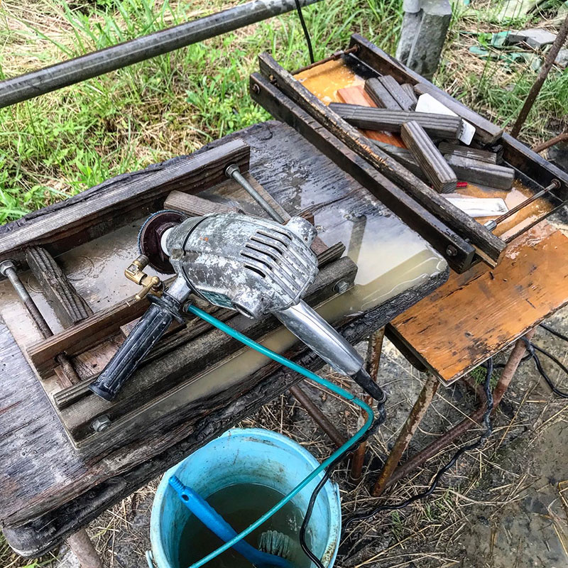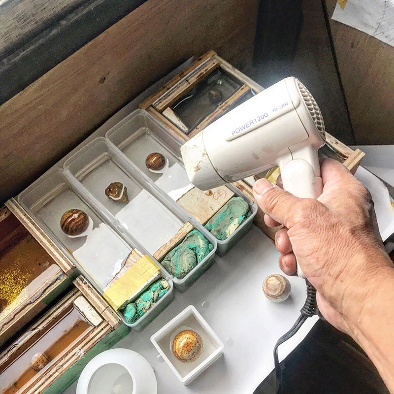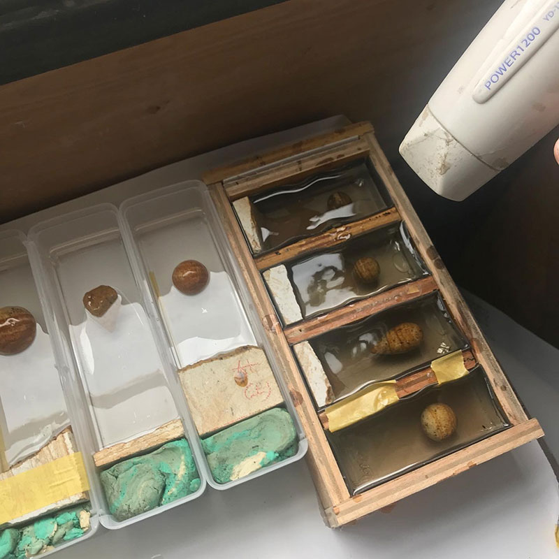 透明樹脂の流し込み。一度に大量にやるとクラックが入ってしまうので少しずつ少しずつ。小さいものでも1週間くらいかかる。