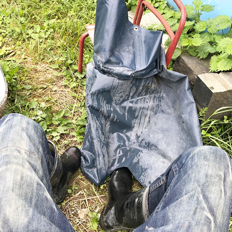 長靴履いて前掛けして。