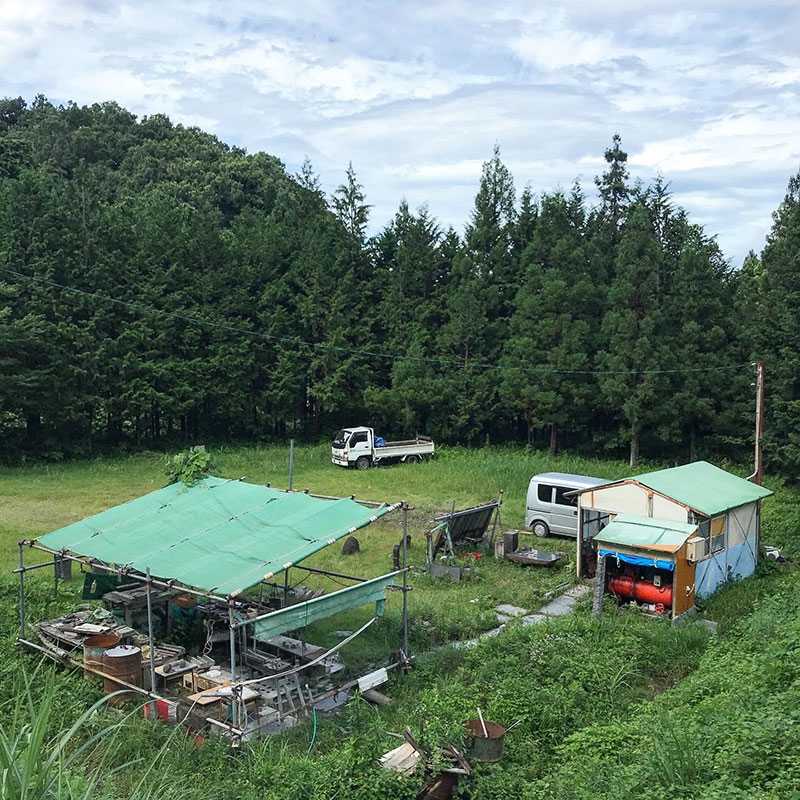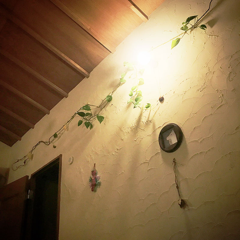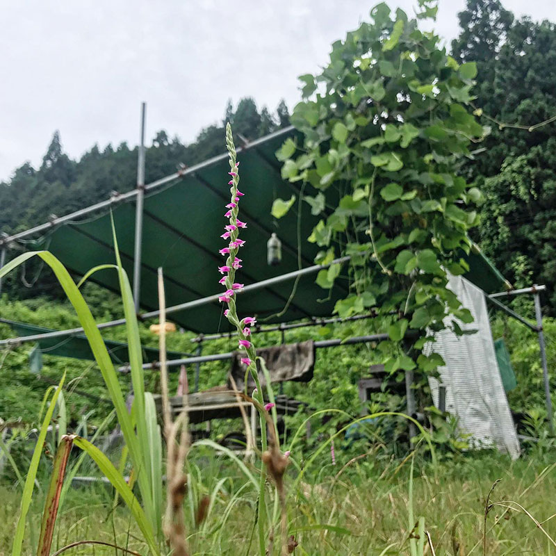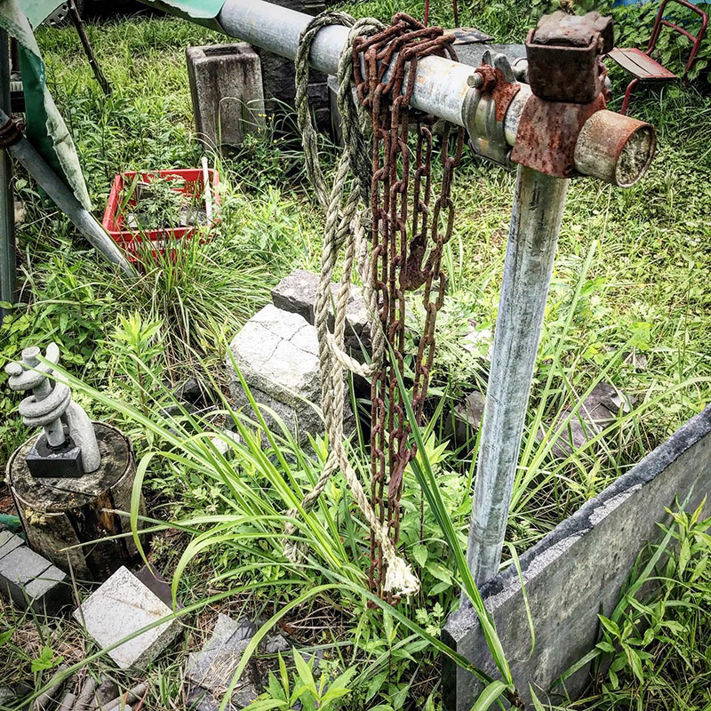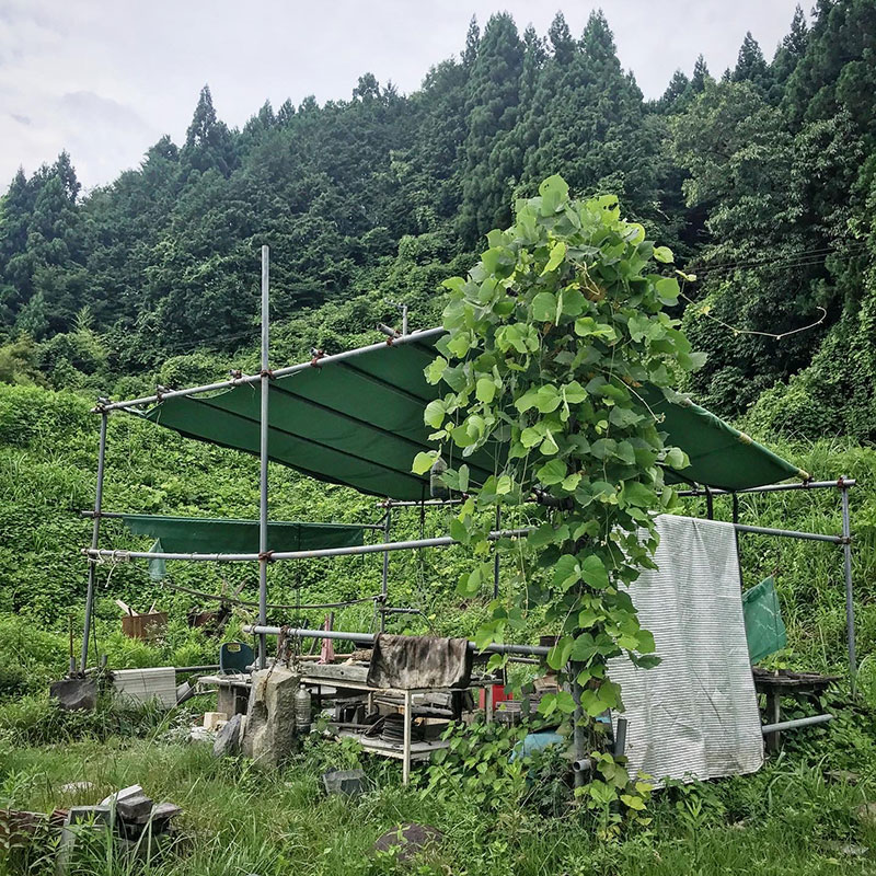 石を彫ったり制作の時、雨と日差しを避けるためのテントに巻きついてきた葛を飾りにしようと刈らずに2、3年。