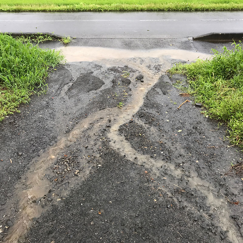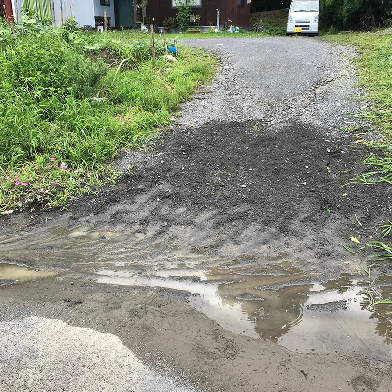 スコール。バケツじゃ無くてドラム缶をひっくり返した様な降り。先日スコップでかき上げた砕石が大量に流された。