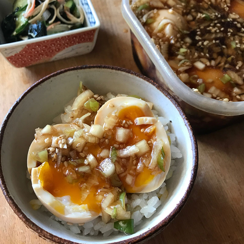 昨晩仕込んだ韓国風の半熟味付け卵で丼の昼飯。